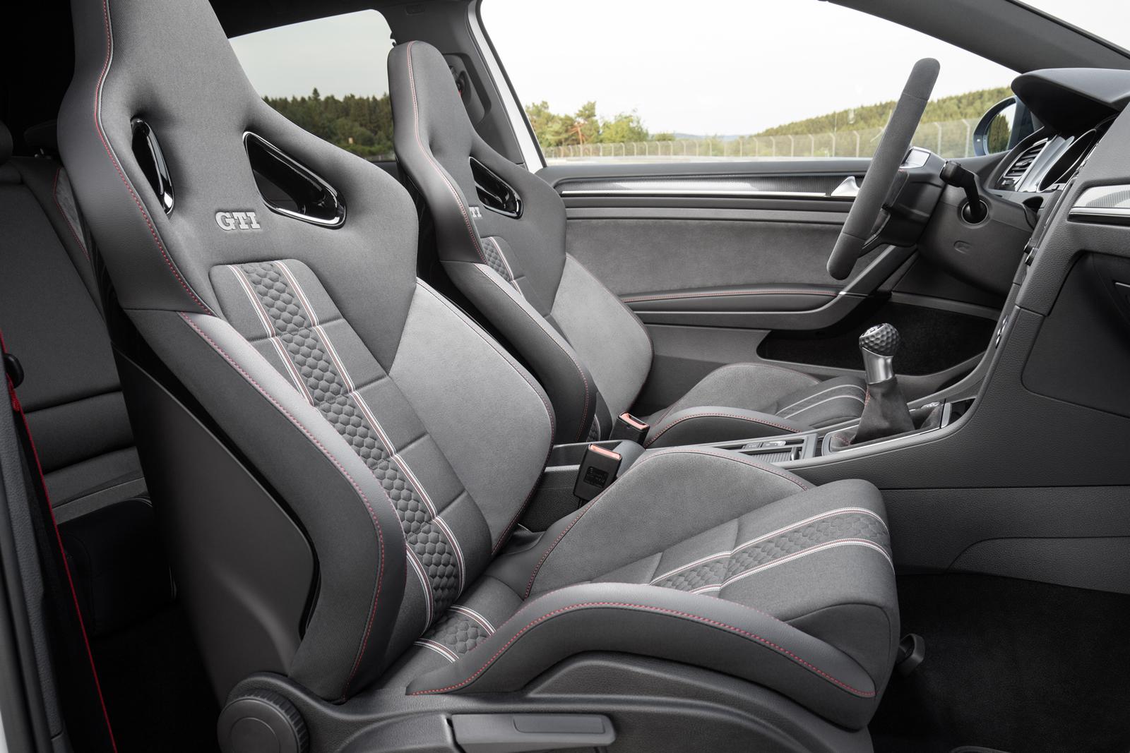 That big roof spoiler and engorged diffuser create enough downforce to make a noticeable difference to the car’s cornering speeds on a circuit, says VW. Apart from the rear wing, Golf-spotters can tell a Clubsport from a regular GTI by its altered front bumper, black-striped sills, bigger tailpipes and different alloy wheel designs.